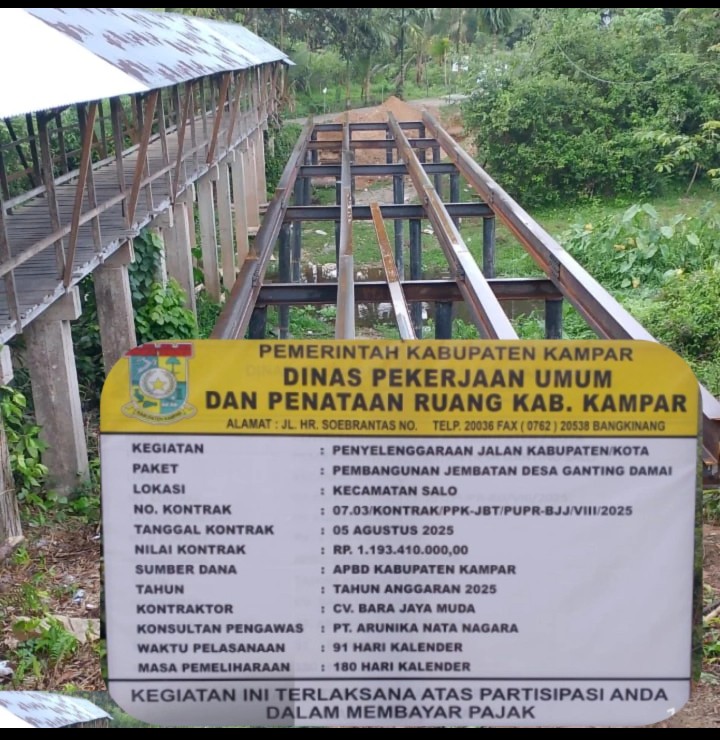 Media, Targetbuser86.com- Salo- Kabupaten-Kampar, 20/10/2025- Kepala Dusun Suka Maju bersama Kepala Desa Ganting Damai mengundang para pemilik lahan untuk melakukan mediasi agar pengerjaan proyek pembangunan jembatan tidak dihentikan oleh warga yang merasa memiliki tanah di kedua sisi jembatan tersebut. Pertemuan dilaksanakan di ruang rapat Kantor Desa Ganting Damai pada hari Jumat, 17 Oktober 2025, dan dihadiri oleh Babinsa, Bhabinkamtibmas, serta empat orang utusan dari Dinas PUPR Kabupaten Kampar, termasuk keluarga dari pemilik lahan dari Sisi Sebelah Pembangunan jambatan yang memiliki lahan di lokasi proyek.