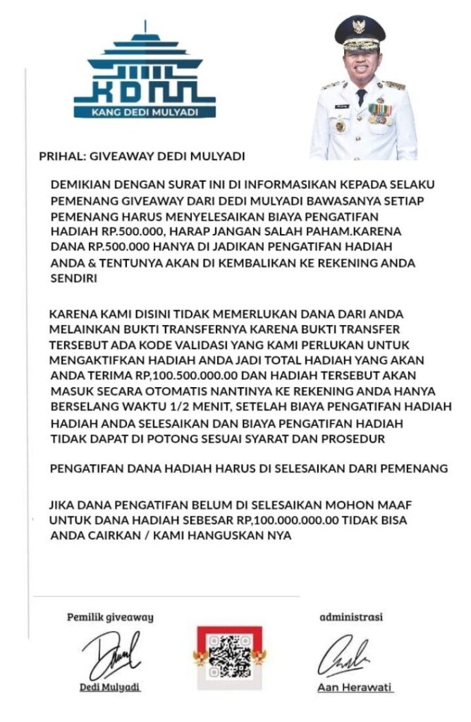 Media”,Targetbuser86.com-Kampar- Riau, 7 Nov 2025 – Setelah saya Cek Kebenarannya Ternyata Giveaway yang dilakukan oleh seorang penipu Meng Atas nama kan Kang Dedi Mulyadi KDM Gubernur Jawa Barat, ini penipuan semuanya, Himbauan Kepada Seluruh Lapisan. Masyarakat indonesi, agar tidak mudah percaya – dengan penipuan Berkedok Pemenang GIVEAWAY Pemenang terpilih mendapatkan hadiah Rp 100 Seratus juta rupiah – Sebelum Pencairan dana tersebut terlebih dahulu pemenang di Suruh Transfer Rp 500.000 – ( Lima ratus ribu rupiah ) Untuk Meng aktif hadiahnya Validasi terlebih dahulu data anda ungkap Penipu tersebut-yang telah melakukan Vidio coll menggunakan Vidio coll Double Handphone WhatsApp.