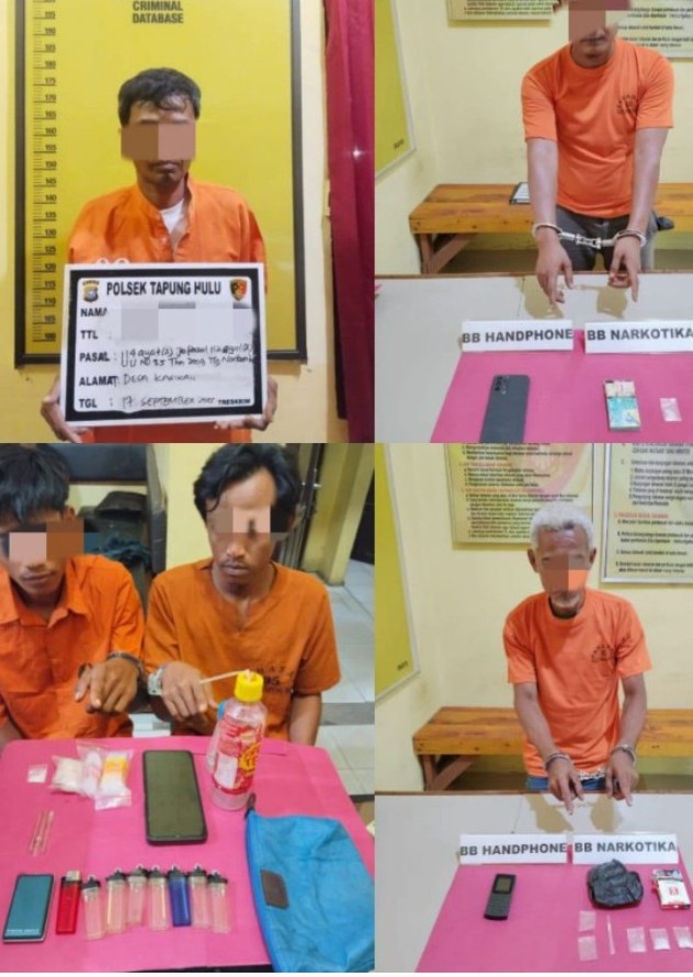 • Polsek Tapung Hulu: Kembali mengamankan dua pelaku berinisial AN (36) dan AD (28) di sebuah bengkel di Desa Kasikan dengan barang bukti sabu-sabu seberat 0,40 gram.